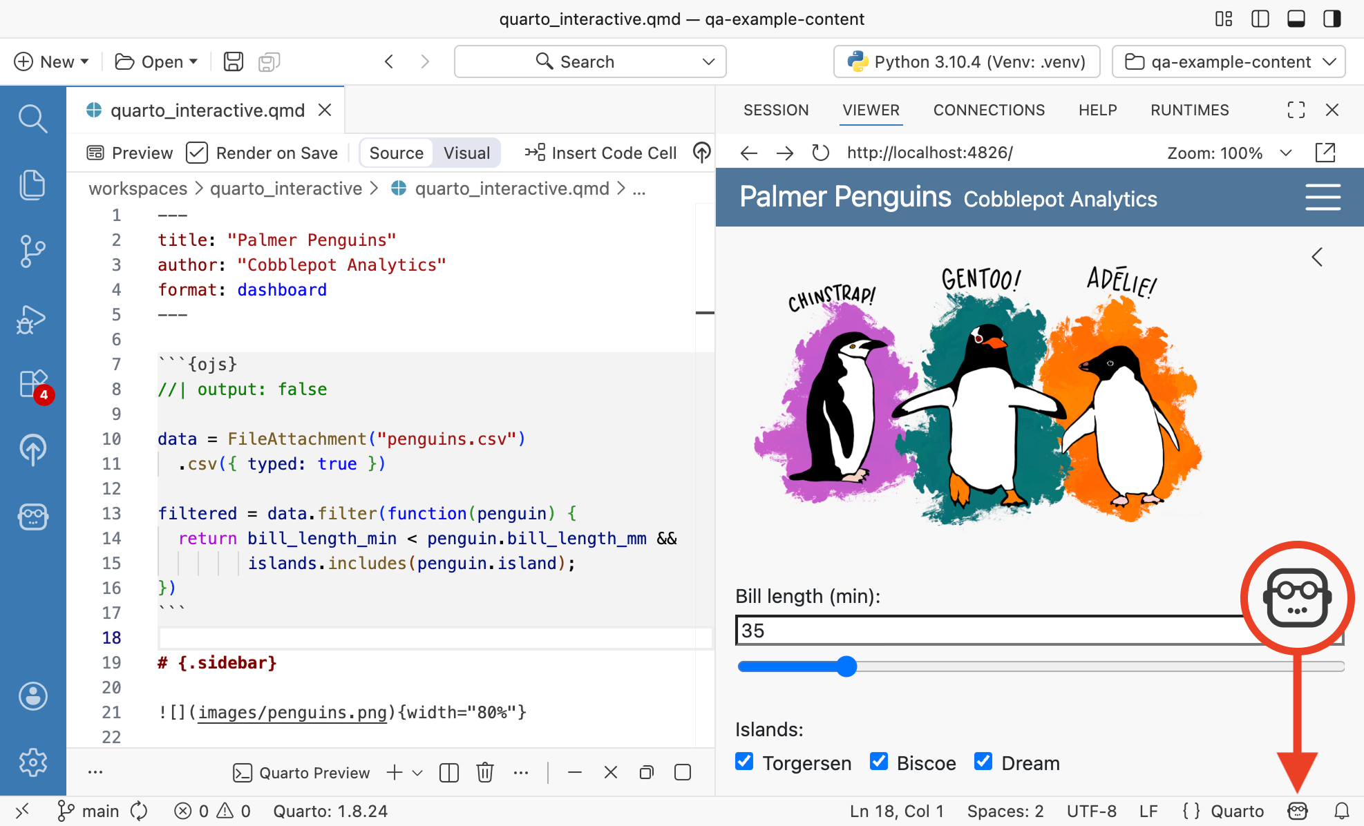 The Assistant status bar icon indicates the current state of code completions from Positron Assistant.